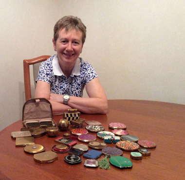 The BCCS Community Getting To Know Each Other/ Everyday Women and Their Compacts Doline Member Doline lives in rural Aberdeenshire with her husband. They have two daughters and ‘four fantastic grandchildren’. She works as a Visitor Services Manager at a local castle which keeps her very busy. She is very lucky to have lots of great areas around for walking and also lives not too far from the coast. Despite her busy life she finds time to enjoy shopping, knitting, sewing and, of course, trawling round junk/antique shops for that special something, which has included in the past, Lilliput Lane Cottages (but they took up too much room) and small silver items such as Vesta cases and butter forks. However, one of her best finds were two small black Deco compacts sitting in a pile in a cabinet in a shop full to the brim of all sorts of antiques, junk etc. They were not expensive and she was thrilled to find them. Compacts have become her most enjoyable collecting hobby- so far! Doline has been collecting for about twelve years after she was given one as a gift. Her husband purchased a silver compact for her for her 50th birthday on a visit to a local antique shop. He was running out of gift ideas and, as husbands tend to do, grabbed the opportunity to buy it when he saw she was admiring it. It is obviously his fault that she is now totally hooked! This first compact (pictured) is quite a simple little square silver one. On the rear it says ‘Sterling and Birks’. According to Doline ‘Birks’ are a Canadian firm still running today it would seem. Henry Birks parents’ emigrated to Canada from England and his ancestry can be traced back to a Sheffield cutler called William Birks. At the last count Doline had 422 compacts about half of these are Strattons which she loves for the huge variety of designs and that they also made sorts of items from portable ashtrays to pill boxes and address books. She is reminded of Hercule Poirot each time she sees the little portable ashtrays but Doline finds the 1960s compacts the most fun. She also adores little Deco compacts and has quite a few with initials on them. Like many of us she often wonders who these people were. It is often interesting to know how collectors look after and care for their compacts. Doline says that she stores them in little plastic front bags but does check them every now and again. She also tends to take out any old powder. One of the downsides of Doline’s location is that she has to travel a fair distance to find compacts so if anyone is selling any unusual ones or if there are any Scottish collectors’ out there she would love to hear from you so please get in touch with her for, as she says ‘It can get a bit isolated from other collectors’ and finally she hopes, ‘one of these days’ to get to a Convention. (Maybe this is could be a special treat for her from someone who has run out of ideas for a birthday in the future!) If you would like to get in touch with Doline please email secretary@bccs.co.uk and your email will be forwarded to her.