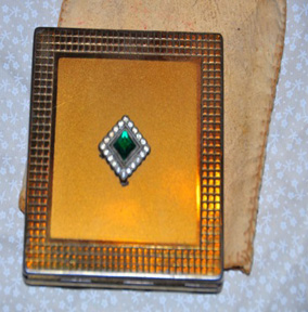 THE LIVES OF EVERYDAY WOMEN AND THEIR COMPACTS This article really began at the Bracknell Convention in 2014 when Katherine Higgins was our Guest Speaker and ‘The Lightbox’, in Woking, had the exhibition ‘Beauty on the Go’. As I have become more involved with BCCS one thing that always strikes me is that most members ask the same question - ‘I wonder who owned this?’ As collectors we hold a little piece of social history in lovers, each with a story to tell. At that Convention I bought an Estee Lauder ‘Bermuda Blue Blossom’ compact. On the back is inscribed ‘Forever in my Heart’ and around the edge of the powder well ‘Jenny R ‘04’. Inside, the mirror is engraved with ‘Smile’ (although this may have been in the original limited edition design). So, I wondered, ‘Who was Jenny? Why did she no longer own the compact?’ ‘Who gave it to her?’ and as the compact had been moved on was ‘he’ now ‘forever in someone else’s heart!’ Then as I walked around ‘The Lightbox’ exhibition I kept thinking that each of these compacts had a story to be told but now, although prized and cared for, inevitably had anonymous original owners. I recalled a conversation with Helen H when she told me about having her Grandmother’s compact in the drawer of her dressing table so she could look at it every time she opened the drawer and I thought of the compact which started my own collection. It belonged to my mother who gave it to me more than twenty years ago arousing my interest in collecting and, although not of great monetary value is a precious piece but, if my collection is disposed of in the future, how will a new owner know about her or her life? This, then, is the story of the woman who owned the compact. It is not very valuable, made of precious metals or jewels but it does hold fond memories. The compact is approximately 2¾" Square, constructed from goldtone metal with an edge decorated in patterned squares. The centre of the compact is plain metal with a faux jewel decoration made of green and white glass. The base of the compact is finished in black enamel. ‘Manufactured in Czechoslovakia’ is stamped into the metal.